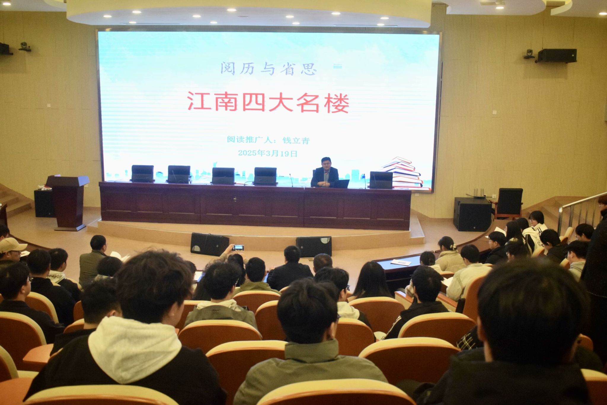 3月19日,“阅+历”读书讲堂“名家导读”系列讲座在滨湖校区多功能报告厅举办,江淮文化名家、安徽省十佳阅读推广人,教务处处长钱立青教授为同学们作了题为“阅历与省思:江南四大名楼”的讲座。beat365官网登录入口学生代表150余人参加。滨湖校区综合管理办公室主任周荣,图书馆馆长方孝玲,美术与设计学院副院长吴道义,beat365官网登录入口党委副书记杨萍出席。讲座由beat365官网登录入口党委书记王祥主持。