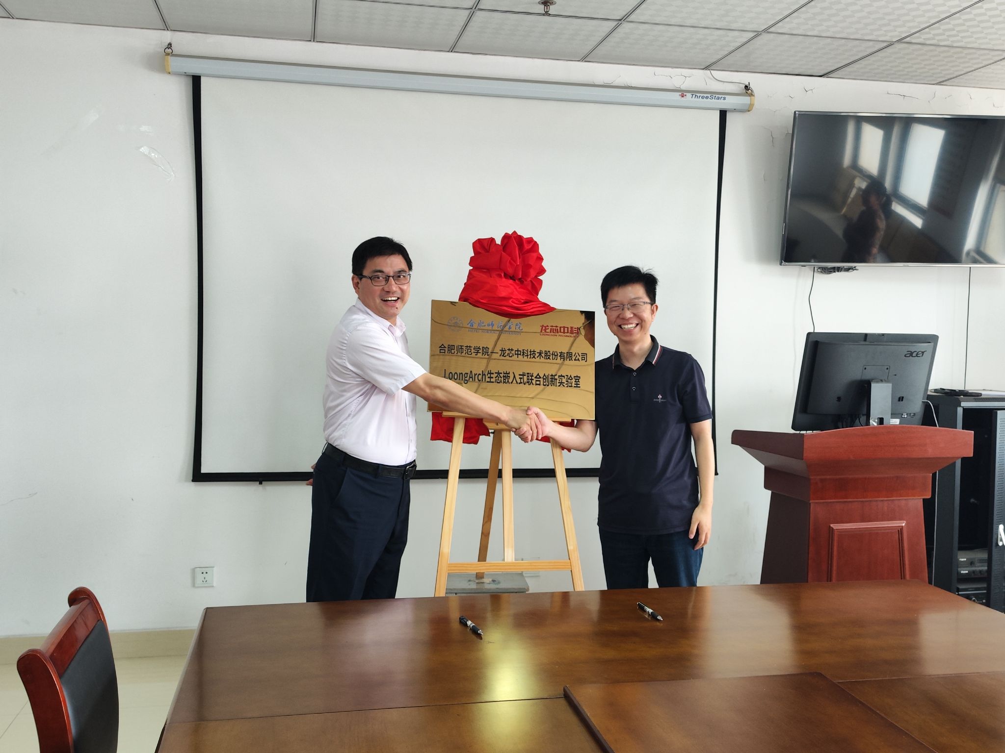 会上,校企双方签署了合作协议,周端明、彭飞为LoongArch生态嵌入式联合创新实验室揭牌,双方就深入合作相关细节进行了研讨和交流。