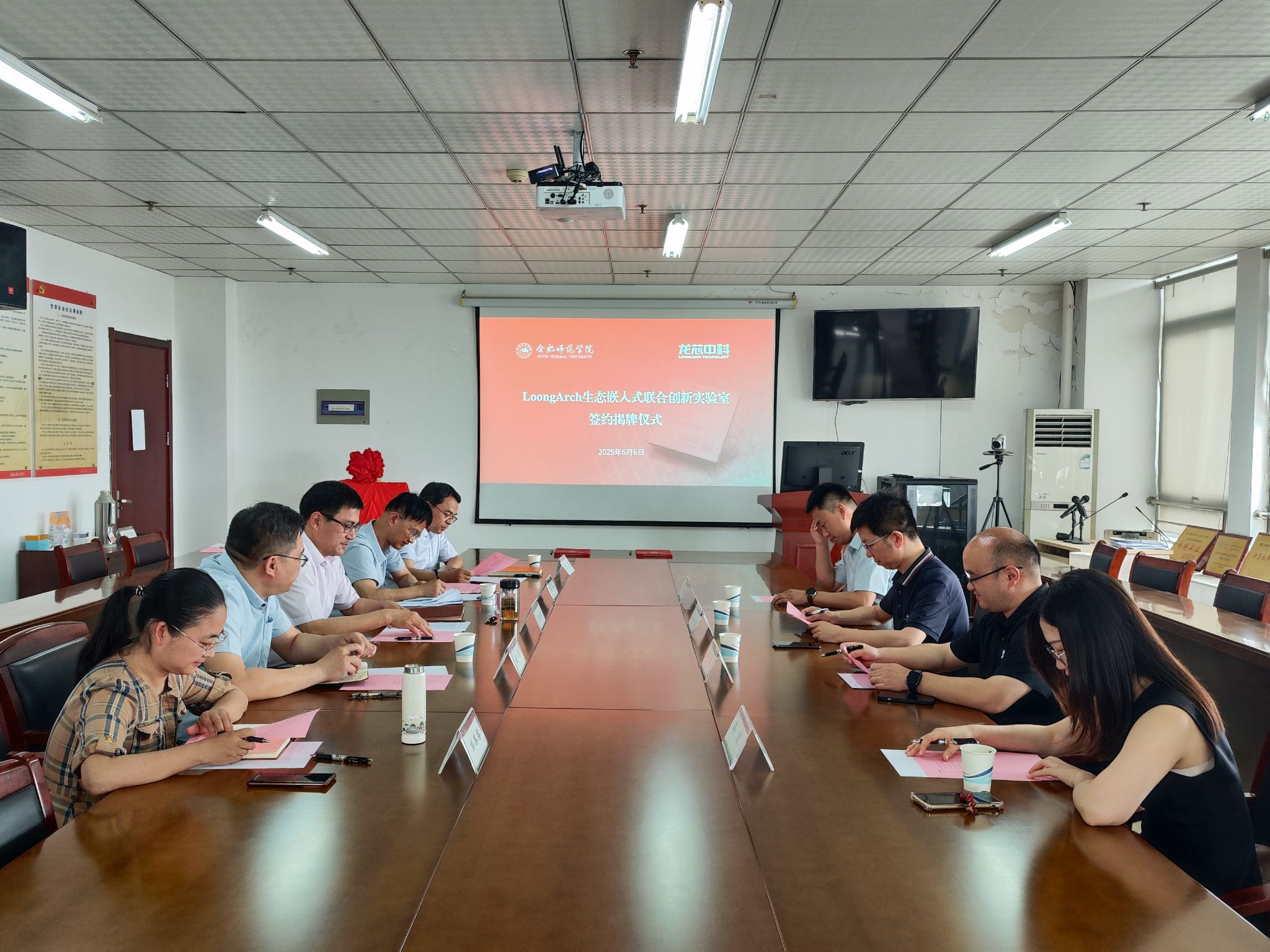 6月6日,beat365网页版登录官网-龙芯中科(合肥)技术有限公司共建LoongArch生态嵌入式联合创新实验室签约暨揭牌仪式在beat365官网登录入口举行。院党委委员、副院长周端明,就业创业工作处处长李健,实验室建设与管理中心主任赵朋,beat365官网登录入口院长谢飞、副院长刘路路,龙芯中科(合肥)总经理彭飞,教育BU经理郭凯,解决方案经理张文阳,业务经理郭丽等出席活动,会议由谢飞主持。