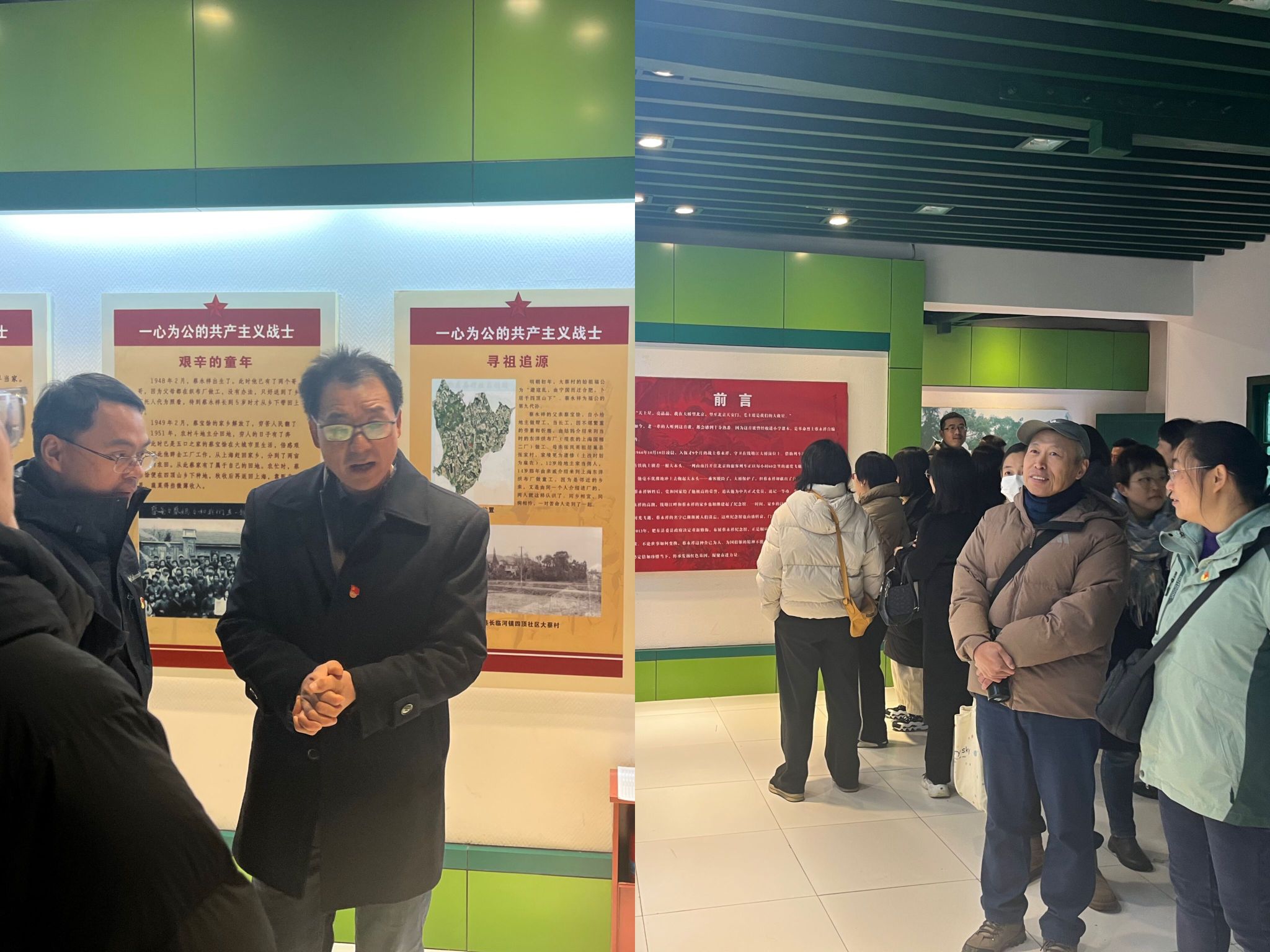 蔡永祥烈士祖籍安徽肥东,1966年2月参军。在连队期间,他努力践行全心全意为人民服务的宗旨。1966年10月10日,为保证火车行进安全,蔡永祥抱着横在铁轨上的木头跃出铁轨,因火车强大气流冲击,年仅18岁的蔡永祥壮烈牺牲。蔡永祥牺牲后,党和国家追认他为中共正式党员、追记一等功。毛主席亲笔题词“一心为公的共产主义战士--蔡永祥”,同时《人民日报》发表社论号召全国人民向蔡永祥学习。在纪念馆,大家认真学习了蔡永祥同志舍身护桥、冒险救人的英雄事迹,革命先烈无惧牺牲的爱国主义精神让同志们产生了深刻触动。